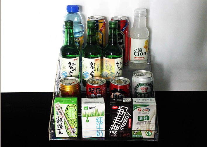 亞克力飲料展示架架子尺寸:三層 寬31cm*高18.8cm*深25.3cm;四層 31cm寬*33cm深*24cm高(亦可根據(jù)客戶需求定制)